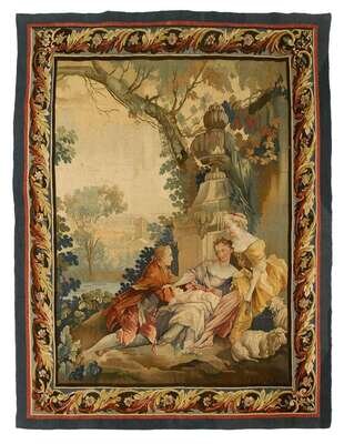 Depicting a lady with attendant and admirer, leaning against a stone monument in a landscape setting, within an acanthus leaf and flowerhead border.