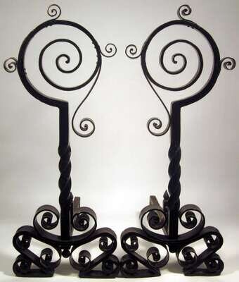 Large pair of black painted wrought iron andirons