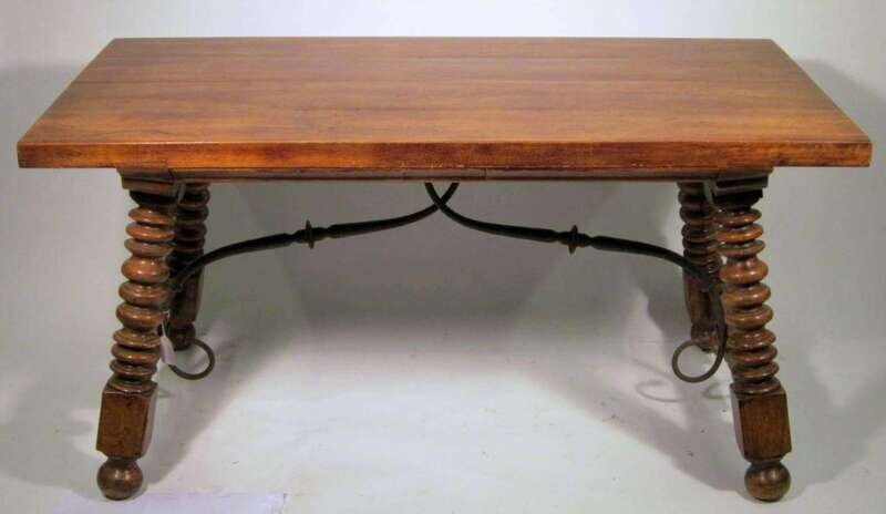 The rectangular top over heavy turned legs united by scrolling iron mounts.