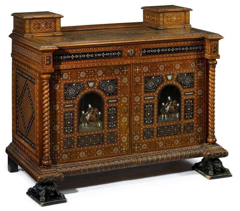 Inlaid all over to with bone and fruitwood to show stars, lozenges, etc. in the Arabesque taste, the rectangular top surmounted by two drawers, above frieze drawer, over two panelled cupboard doors marquetry inlaid to show a mounted rider with attendants, flanked by twisted columns, raised on tortoise-carved feet.