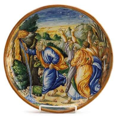 Italian istoriato majolica dish 'Moses striking the rock' 18th/19th century