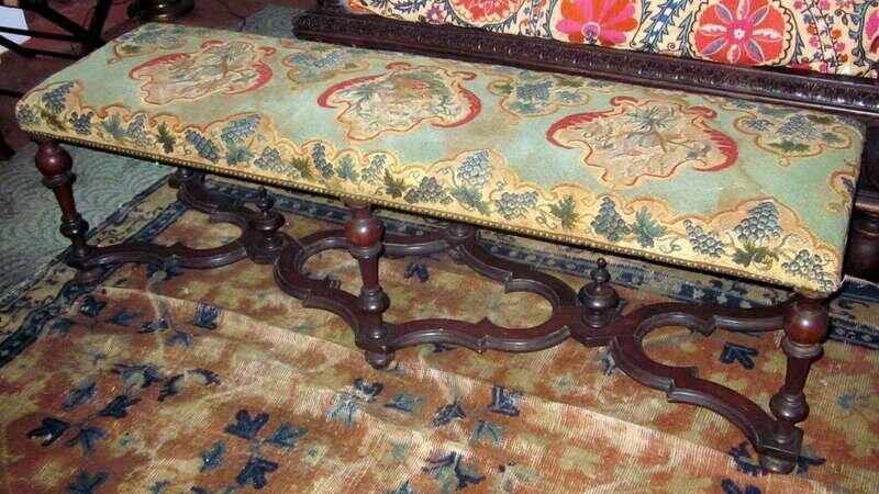 The rectangular needlework upholstered seat raised on turned legs united by wavy stretcher.