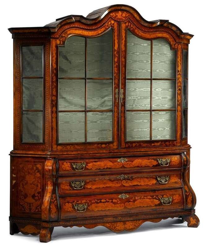 In two sections: the curved top over conforming twin glazed cupboard doors opening to shelves, the lower section of bombe outline, with three graduated long drawers, raised on block feet, the whole profusely inlaid to show flowers, urns and scrolls.