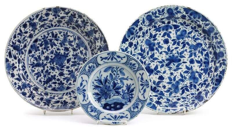 Both decorated to show three-leaf motifs and flowers and leaves; together with a small eighteenth-century Delft plate, decorated in blue camaïeu with flowers and a pierced rock. (3).