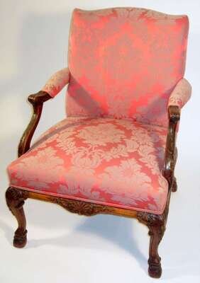 The square back over acanthus carved arms, stuff over seat, raised on slender cabriole legs united by stretchers, terminating in hoof feet; together with a George II style damask upholstered chair. (2).