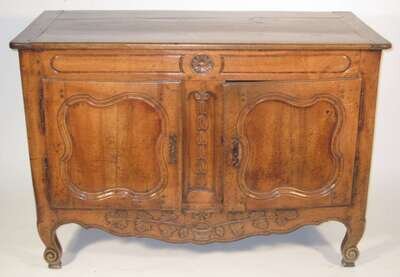 The planked rectangular top with rounded fore-corners over floral carved frieze above two panelled cupboard doors, raised on short cabriole legs and scroll feet.