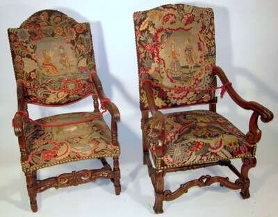 Pair of Louis XV style carved beech and tapestry upholstered fauteuils late 19th/early 20th century