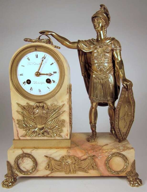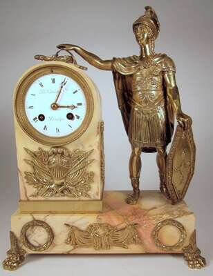 The circular white enamel dial with Roman numerals within an arched marble column, mounted with gilt metal armorials and shields, flanked on one side by a gilt bronze figure of a Roman soldier holding a shield, all raised on a marble plinth, terminating in hairy paw feet.