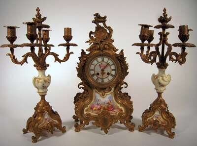 French Louis XV style brass and Sevres style porcelain inset clock garniture late19th/early 20th century, the movement signed japy freres