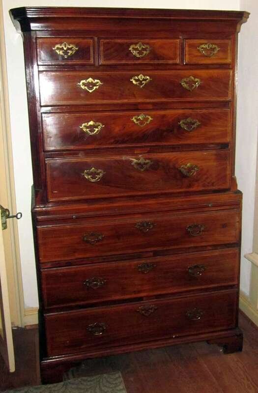In two sections: the cavetto molded cornice above three short and three long graduated drawers, between fluted canted corners, the lower section with brushing slide above three graduted long drawers, all line inlaid, raised on bracket feet.