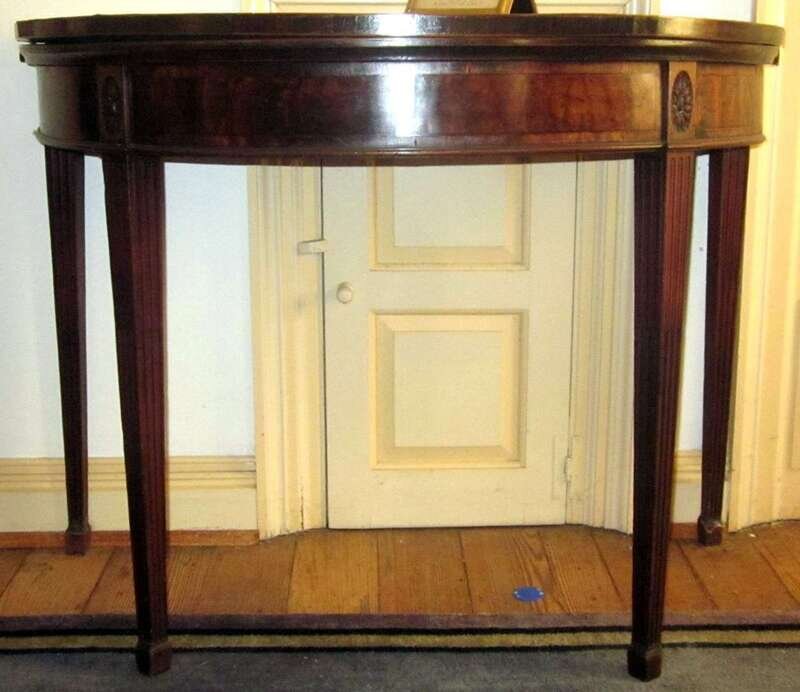 The D-shaped foldover top over rosette carved apron, raised on fluted tapering legs terminating in block feet.