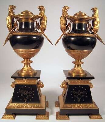 Pair of Continental black marble and gilt bronze mounted urns 20th century