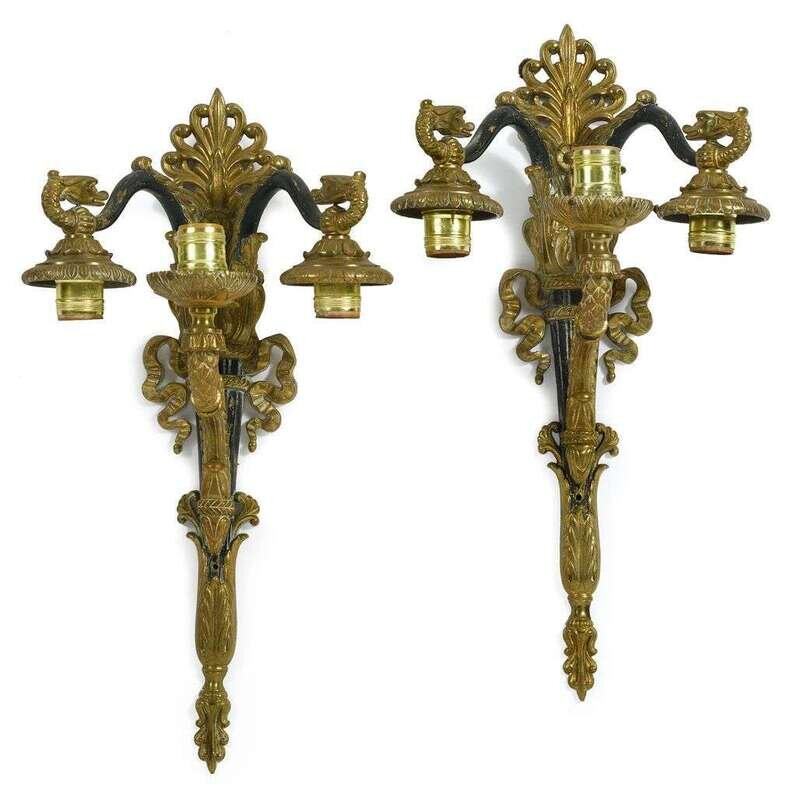 Pair of French Empire style gilt and patinated bronze three light wall sconces 19th century