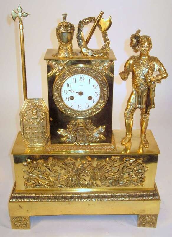 The circular dial with Arabic numerals within rectangular case flanked by a soldier in armor and a shield with halberd, and surmounted by battle axe and helmet, raised on rectangular case worked to show armor and weaponry on block feet.