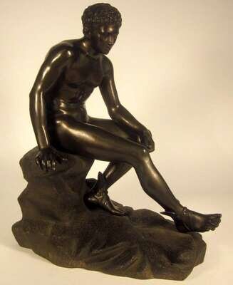 Dark brown patina, the naked Mercury with wings on his ankles seated on a naturalistic base. Drilled where previously mounted as a lamp.