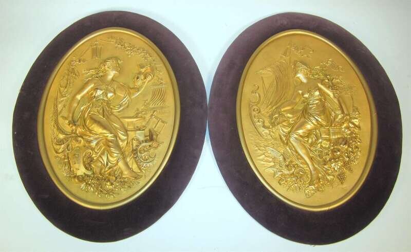 Each cast as allegorical maidens, one allegorical of industry, the other possibly exploration, within velvet lined frames.