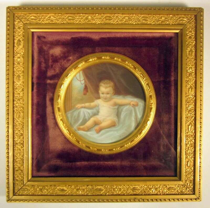 Circular, painted to show the young boy in a sheer night dress, with gold bracelets around his wrists, resting on a sky blue sheet, signed "A. Subit, 1885", with circular giltwood frame, surrounded by velvet mat, within glazed square giltwood frame.