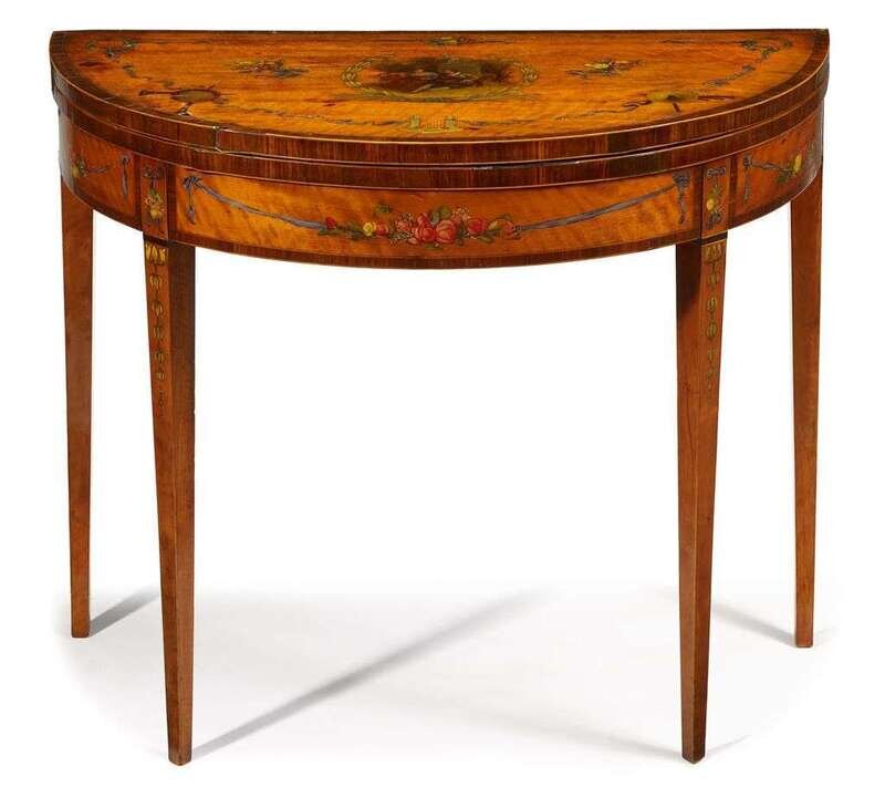 George III style satinwood, rosewood crossbanded and polychrome painted card table some 18th century elements