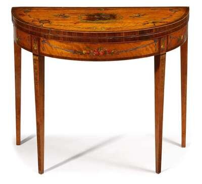 The demi-lune foldover top painted in the center to show a courting couple, surrounded by bouquets of flowers, musical trophies and ribbons, the frieze similarly painted, raised on tapering legs.