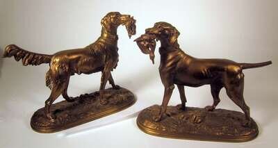 Two bronze models of hunting dogs, each with a bird in its mouth, raised on naturalistic oval bases, signed "Waagen".