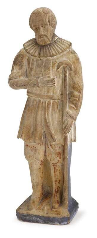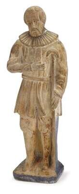 Carved to show a farmer in sixteenth-century dress, wearing a ruff collar and holding a hoe, traces of polychrome, rough hewn back.
