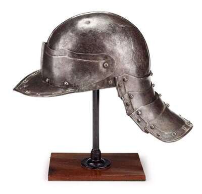 Two piece scull, four-section nape guard, leaf shaped front peak, without ear guards and nasal guard, custom stand.