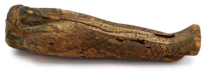 Typical form, with traces of old insect damage, painted to show cross hatching and two bands of hieroglyphics.
