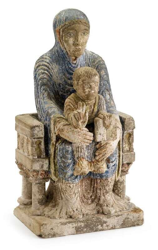 Continental polychrome painted carved limestone group of the Virgin and Child in Majesty sedes sapientiae, in the early gothic style