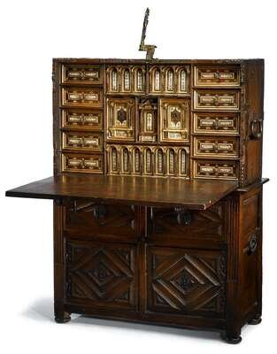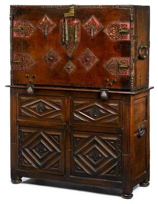 Large Spanish iron mounted walnut vargueno the top with 16th/17th century elements, the base probably 19th century