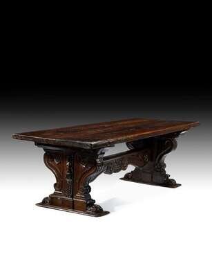 The large planked rectangular top over two boldly carved scroll supports with caryatids to the center, united by similarly carved stretcher.