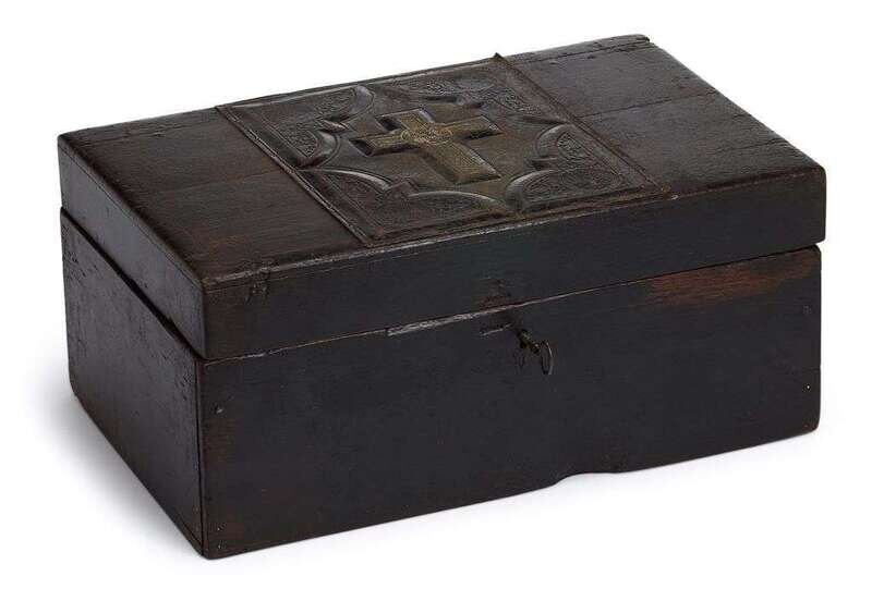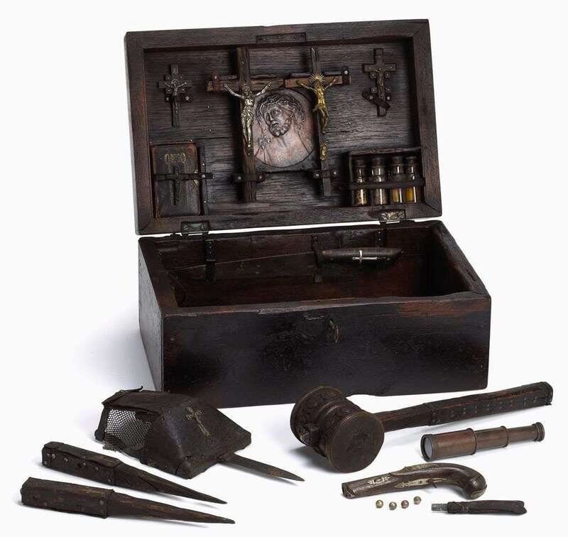 The heavy oak case mounted with an embossed leather panel to top, opening to reveal two large crucifixes, two small crucifixes, a medallion of Christ, four small bottles containing 'Holy Water' etc., a Czech bible, a large gauntlet with dagger, a pistol with powder and shot, shot pincers, a pair of large stakes, mallet, dagger, and telescope.