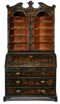 In two sections: the broken pediment top over twin arched doors (lacking panes), opening to a series of shelves, the lower section with drop down writing surface opening to a red lacquered interior with drawers and pigeon holes, above two short and two long drawers, raised on bracket feet. The whole green lacquered all over to show Chinoiserie scenes.