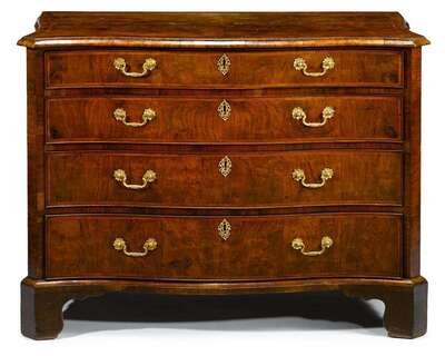 The serpentine quarter veneered featherbanded and rosewood crossbanded top over four graduating long drawers, raised on shaped bracket feet.