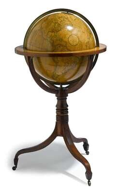 Comprised of twenty engraved gores, the cartouche reading "Cary's new terrestrial globe : exhibiting the tracks and discoveries made by Captain Cook : also those of Captain Vancouver on the North West Coast of America and M. de la Pe´rouse on the coast of Tartary : together with every other improvement collected from various navigators and travellers to the present time... W. Cary, sold by S. & J. Duncan, Glasgow, 1817", with brass meridien ring, on stand issuing three downswept legs terminating in brass caps and castors.