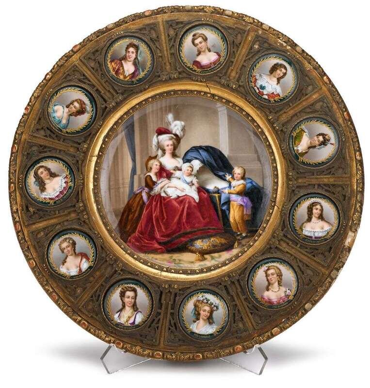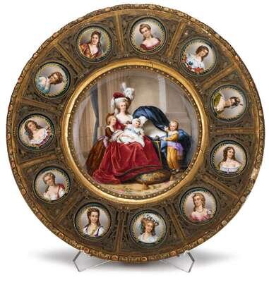 The circular top with acanthus edge, centered by a large porcelain charger depicting Marie Antoinette and her children, surrounded by eleven porcelain roundel plaques depicting French ladies of nobility, each within gilt metal border. The reverse of the charger with impressed and factory marks, and titled in German.