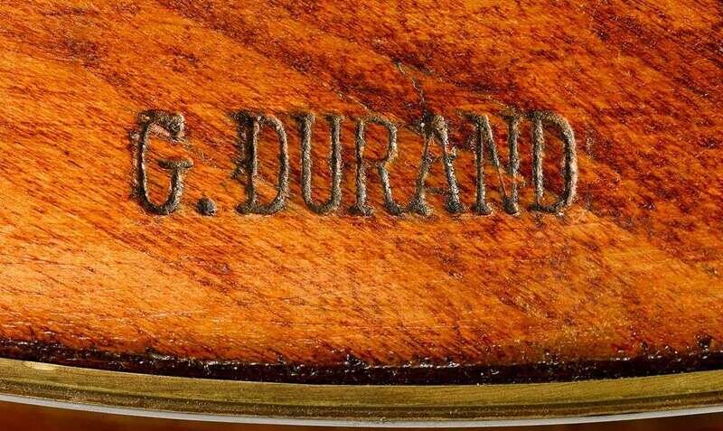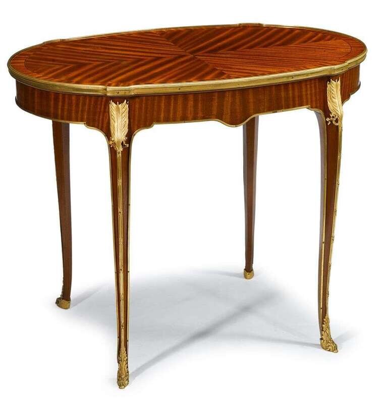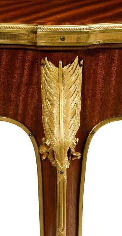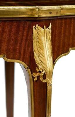 The shaped crossbanded quarter veneered oval top with satinwood and ebony line inlay, gilt bronze banded edge, the well-cast mounts in the form of arrow fletching, continuing to acanthus cast sabots. Stamped twice 'G. Durand", to underside.