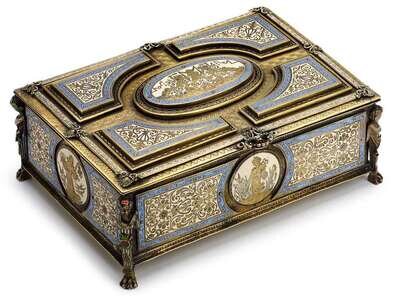 Rectangular form, the lid with central raised oval panel enameled in cream and blue, surrounded by four raised spandral panels, within a cream enameled border with blue, green, and red enameled scallop shells, the sides enameled in cream and blue to show scrolls, each with central neoclassical medallion, four varicolored enameled caryatids at corners, raised on hairy paw feet.
