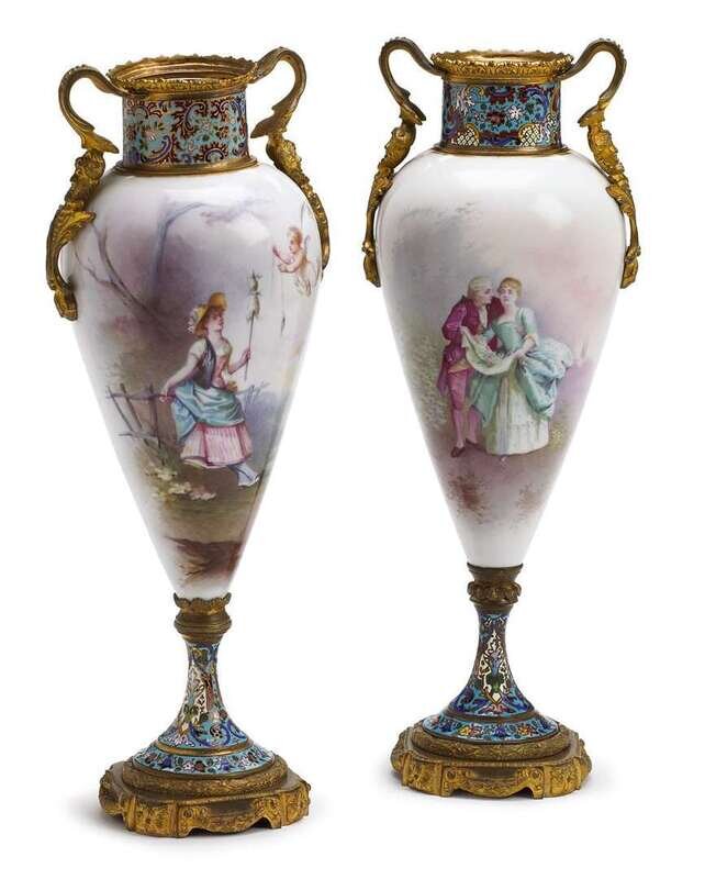 Baluster form, the gilt bronze rim over champlevé enameled neck and porcelain body painted to show a courting couple and a maiden with a cherub in a landscape, the reverse painted to show architectural landscapes, over similarly enameled socle raised on foliate swag cast base.