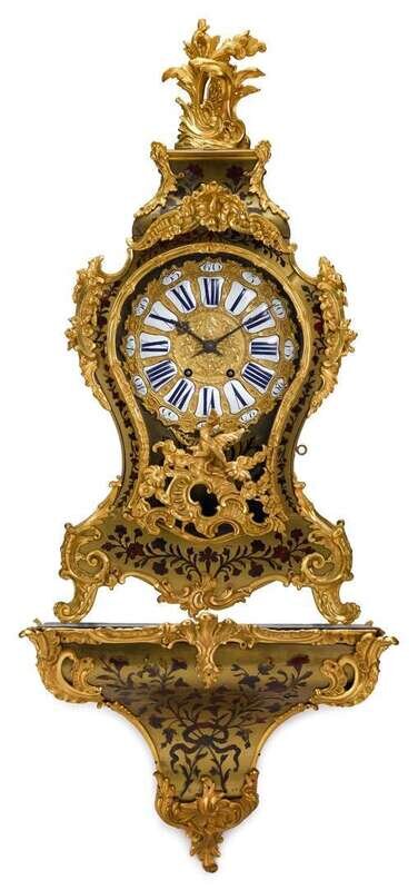 The gilt bronze dial with enameled porcelain Roman hours and Arabic minutes, within a boulle case mounted all over with rocaille bronze mounts, raised on conforming bracket.