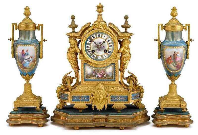 The circular porcelain dial with Roman numerals, painted to show songbirds in flight, the movement with Japy freres medaille d'honneur cachet, the gilt bronze case well cast in the Louis XVI style to show acanthus, masks and putti, with inset porcelain plaques depicting eighteenth-century figures or enameled 'jewels' on a blue ground, the garniture urns similarly decorated and with pull-off covers reversible to a candle-nozzle, each piece on original velvet-lined wooden base.