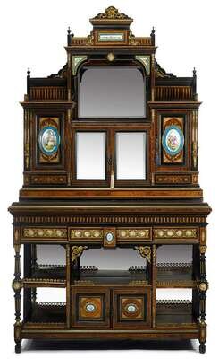 Large Napoleon III gilt metal and Sevres style porcelain mounted, burl walnut, ebonised and inlaid secretaire cabinet 19th century