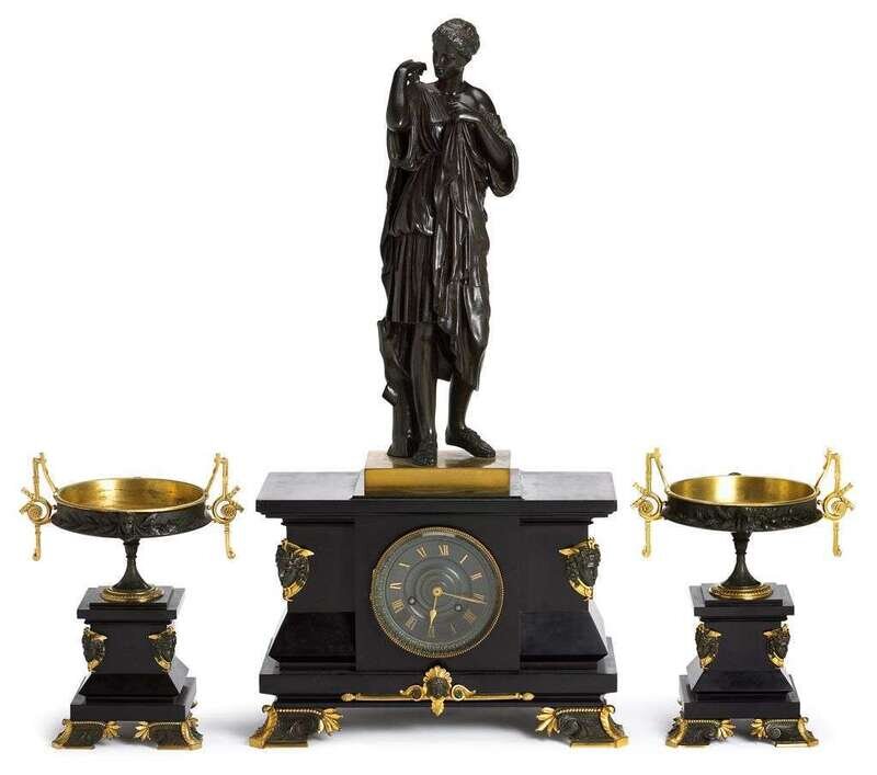 The rectangular black marble case surmounted by a neoclassical maiden, mounted with classical masks at the corners, the bronze dial with gilt bronze Roman numerals, the back of the movement stamped with Vincenti & cie. seal, also stamped 'G S medaille d'or 1867", raised on scroll and leaf cast feet; together with two original conforming garniture tazzas. (3).