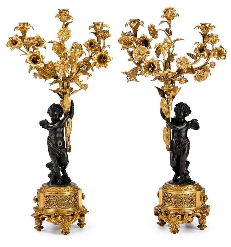 Each cast to show a figure of cupid holding a torch issuing six candle nozzles and numerous flowers, raised on circular marble and gilt bronze base cast to show rocaille and flowers, the candlearms stamped with initials 'b', the underside of one base stamped H. Picard.