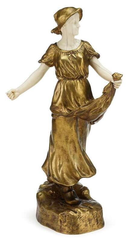 Gilt bronze, with ivory head and arms, depicting the girl scattering seeds she holds in her apron, on a naturalistic base, signed "E. Bernoud".