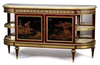 Of bowfront outline, the white marble inset top within a gilt bronze border, above a gilt bronze vitruvian scroll frieze, above two black lacquered chinoiserie panelled doors, flanked by two marble galleried shelves on either side, raised on short tapering legs terminating in brass caps.