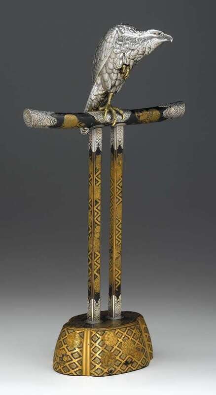 Fine Japanese silvered bronze model of a hawk, on silver mounted lacquered stand meiji period
