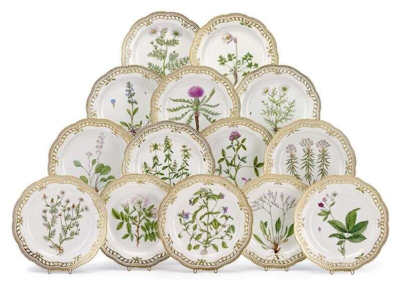 Set of fourteen Royal Copenhagen Flora Danica porcelain dinner plates