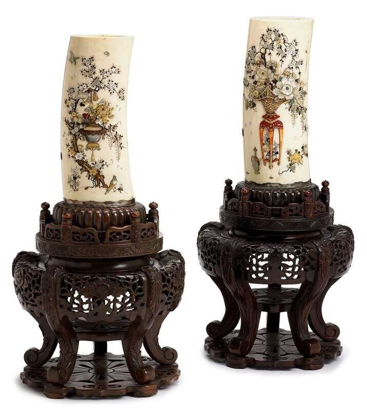 Fine and large pair of Japanese shibayama inlaid ivory tusks on wood stands meiji period, signed tablet mark