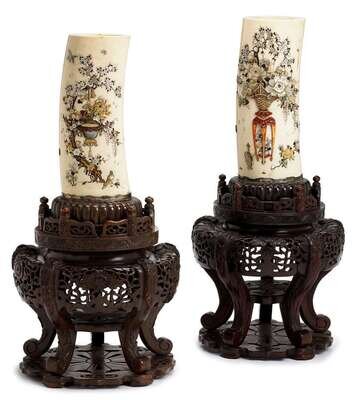 Each single tusk section mounted with mother of pearl, abalone, ivory and tortoiseshell to show flowering trees, and birds in flight, on large carved wood stands.