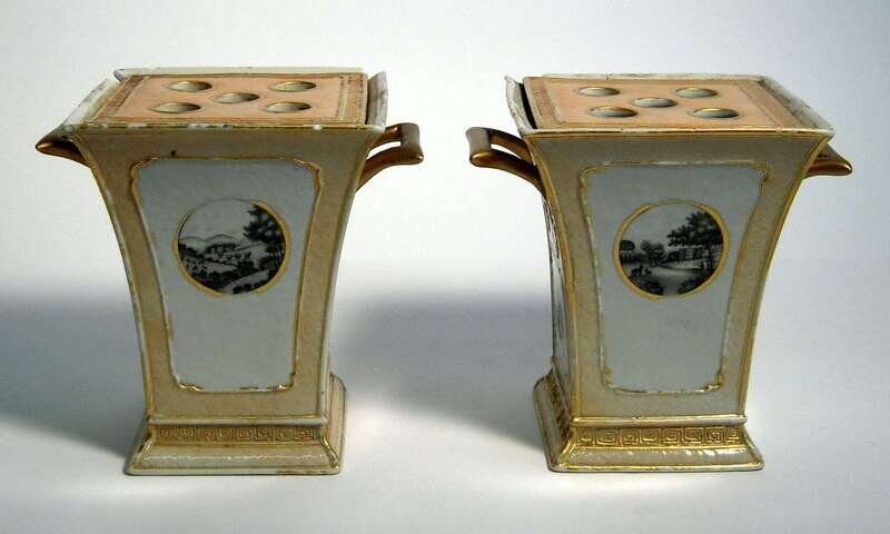 Square tapering form, the basket-weave and Greek key molded cover and pot with oval and circular grisaille painted cartouches depicting architectural and figural landscapes.